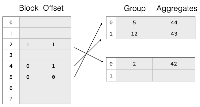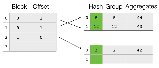 There are two main approaches to work around this problem: “Chaining” or “linear probing”. With chaining, we do not keep the aggregate values in the hash table directly, but rather keep a list of group values and aggregates. If grouping values points to a hash table entry with an empty list, the new group and the aggregates are simply added. If grouping values point to an existing list, we check for every list entry whether the grouping values match. If so, we update the aggregates for that group. If not, we create a new list entry. In linear probing there are no such lists, but on finding an existing entry, we will compare the grouping values, and if they match we will update the entry. If they do not match, we move one entry down in the hash table and try again. This process finishes when either a matching group entry has been found or an empty hash table entry is found. While theoretically equivalent, computer hardware architecture will favor linear probing because of cache locality. Because linear probing walks the hash table entries linearly, the next entry will very likely be in the CPU cache and hence access is faster. Chaining will generally lead to random access and much worse performance on modern hardware architectures. We have therefore adopted linear probing for our aggregate hash table.