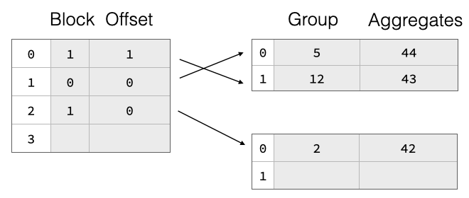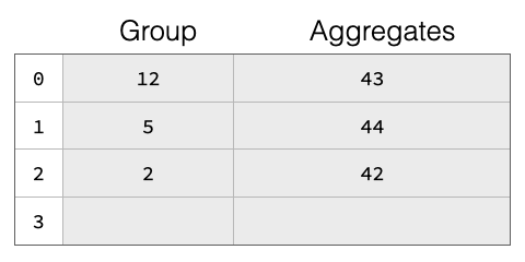 Both chaining and linear probing will degrade in theoretical lookup performance from O(1) to O(n) wrt hash table size if there are too many collisions, i.e., too many groups hashing to the same hash table entry. A common solution to this problem is to resize the hash table once the “fill ratio” exceeds some threshold, e.g., 75% is the default for Java’s HashMap. This is particularly important as we do not know the amount of groups in the result before starting the aggregation. Neither do we assume to know the amount of rows in the input table. We thus start with a fairly small hash table and resize it once the fill ratio exceeds a threshold. The basic hash table structure is shown in the figure below, the table has four slots 0-4. There are already three groups in the table, with group keys 12, 5 and 2. Each group has aggregate values (e.g., from a SUM) of 43 etc.