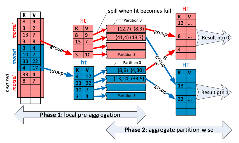 One interesting detail is that we never need to build a final (possibly giant) hash table that holds all the groups because the radix group partitioning ensures that each group is localized to a partition.